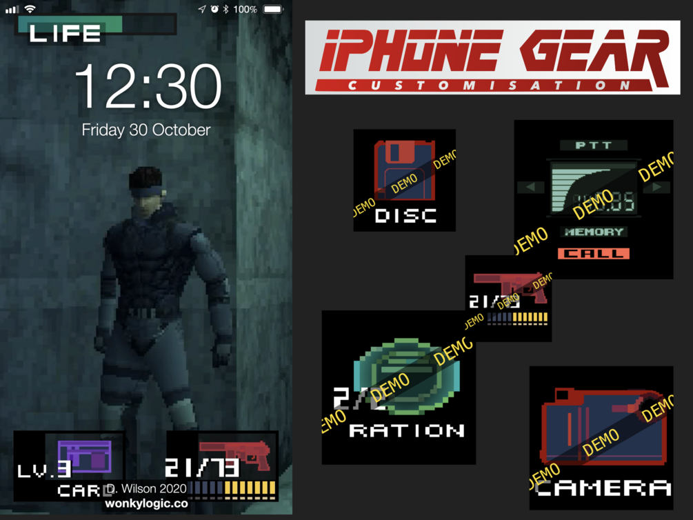 Metal Gear Solid (1998) themed animated lock screen (Live Photo), a set of eight icons and instructions for setting up customised app launcher Shortcuts.  AND a new sound file: .